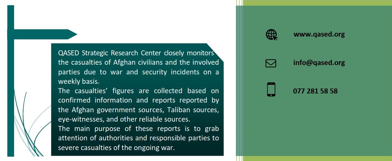This week’s report shows that civilians suffered heavy casualties in several incidents. On one hand, the bloody airstrikes of foreign forces increased the civilian casualties, in which only one attack killed 31 civilians and wounded 40 more in Nangarhar province. On the other hand, incidents caused by Taliban resulted an increase in civilians casualties considering the deadliest attacks which took place in Kabul, Parwan and Zabul, where in these three blasts, at least 60 civilians were killed and 170 others injured.
