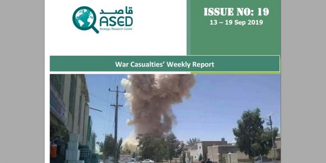 This report covers the casualties of the ongoing war, which have been occurred in different areas of the county during September 13 – 19, 2019. Overall, 586 people have been killed or wounded this week (318 have been killed and 268 have been wounded).